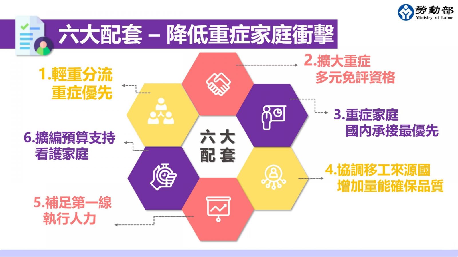 勞動部統計,新增符合資格者為65.5萬人,推估其中10萬人有聘雇需求。勞動力發展署副署長陳世昌表示,近期看到許多看護工要求加薪或希望轉換至照顧較為輕鬆的家庭,為減少對重症家庭衝擊,勞動部與衛福部祭出6大配套因應。包含輕重分流及重症優先、擴大重症多元免評資格、重症家庭國內承接最優先、協調移工來源國增加量能確保品質、補足第一線執行人力、擴編預算支持看護家庭。
